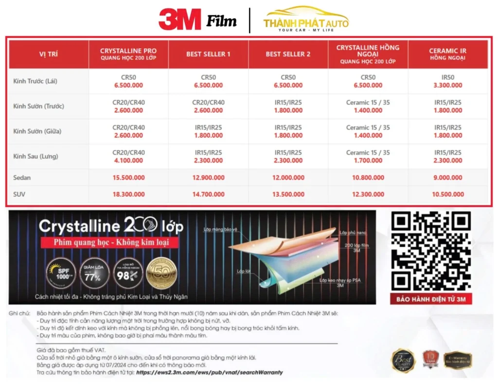 - 3M Crystalline PRO (CR20 / CR40 / CR50): Phim quang học 200+ lớp, khả năng chống nóng và cản tia hồng ngoại vượt trội, không ảnh hưởng sóng GPS.